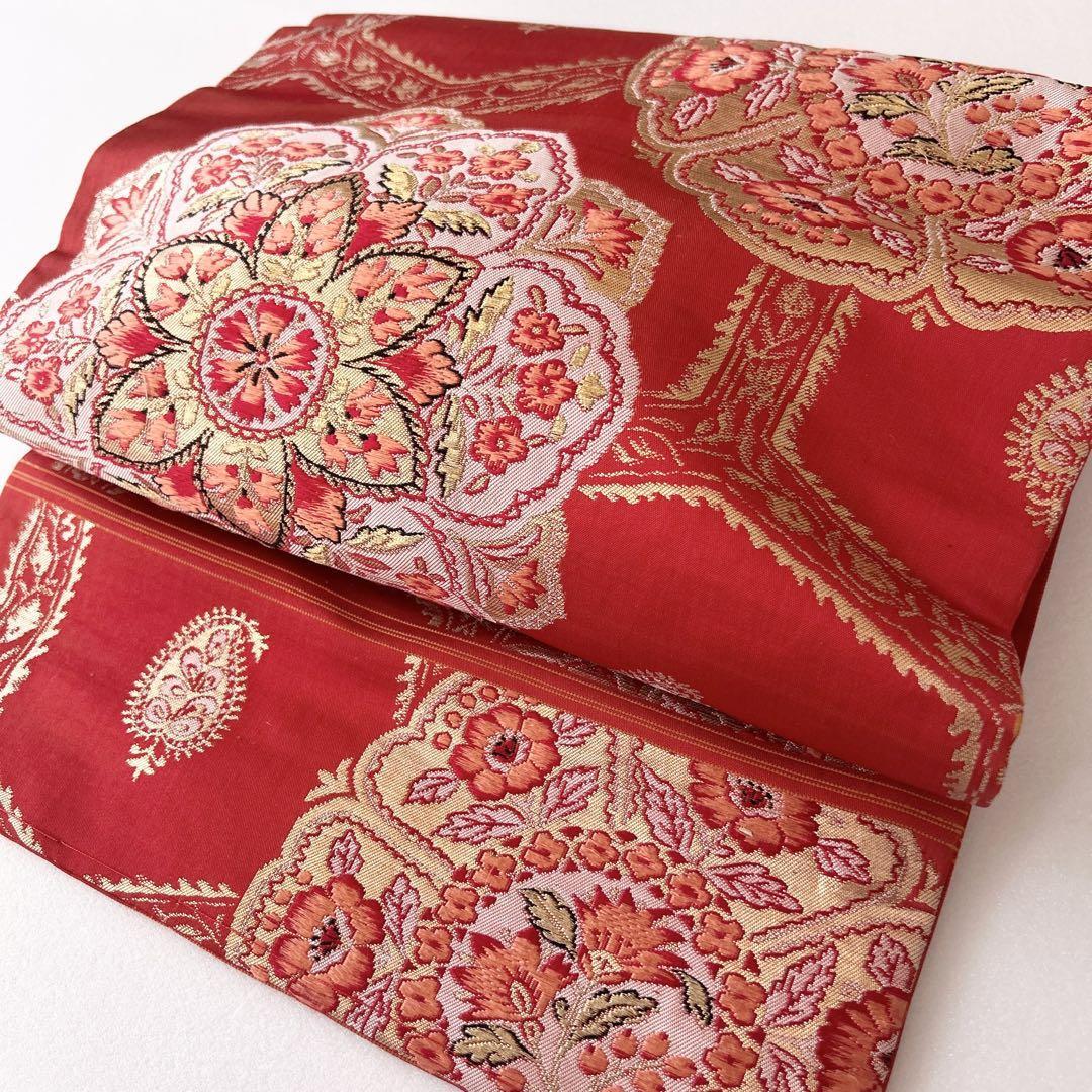 - 正絹 名古屋帯 六通柄 華文様 朱色 金糸織り 上品フォーマル