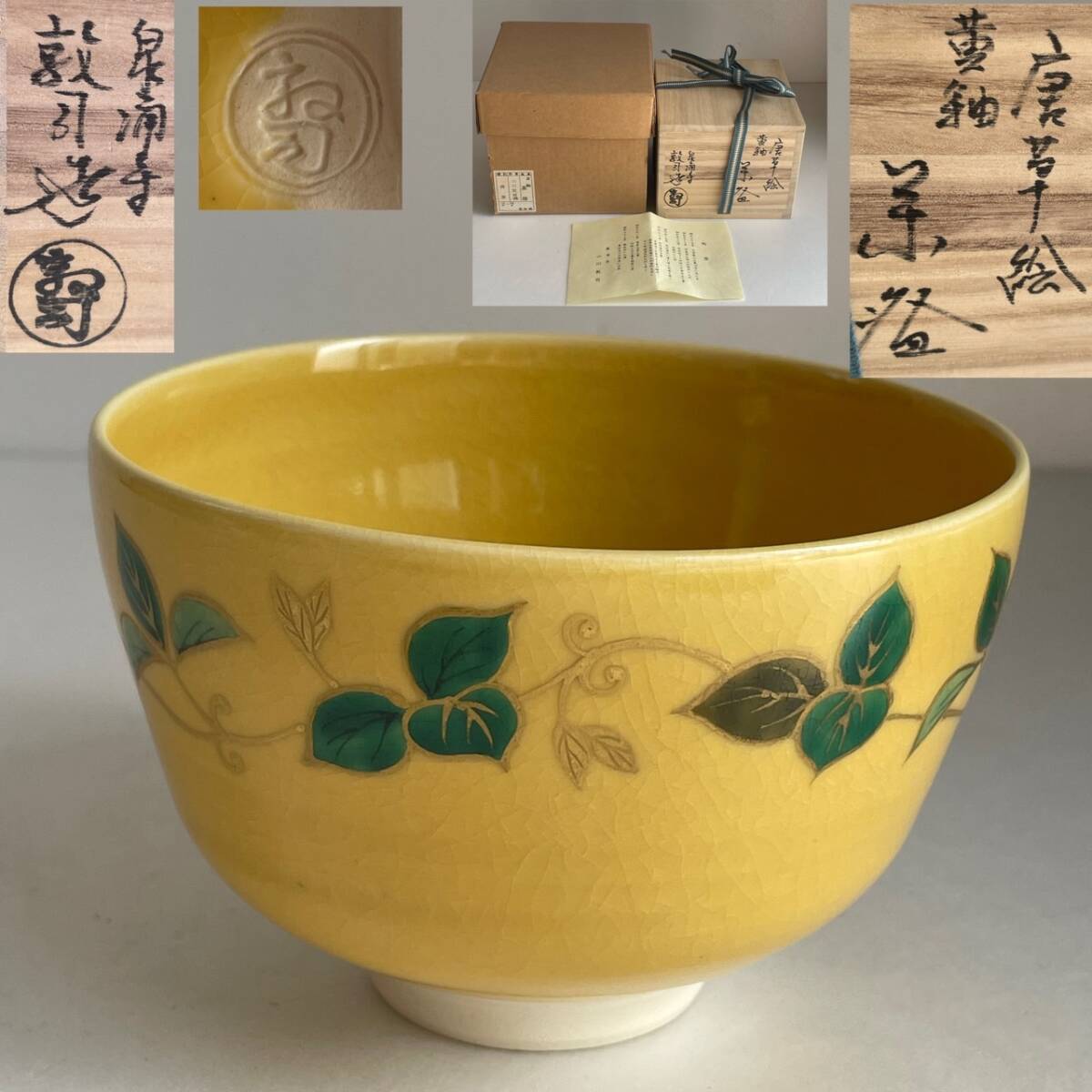 - 【和美】山川敦司 泉涌寺 唐草絵 黄釉 茶碗 共箱 茶碗 茶道具 本物保証 20