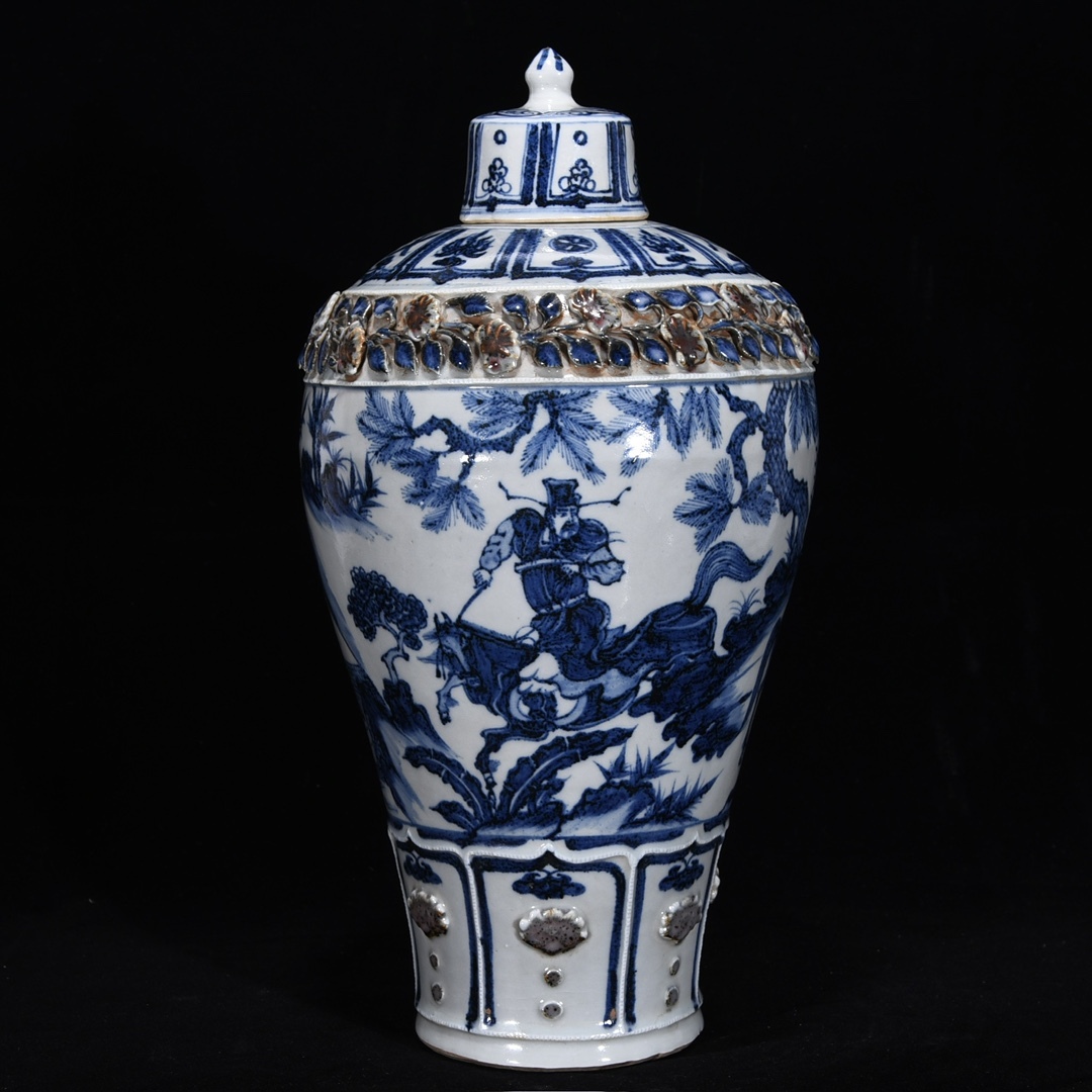 - 磁器 元時代 青花釉里紅捏花・蕭何月下追韓信人物梅瓶・花瓶 秘蔵 37cm古陶磁器 陶芸 唐物 古賞物 時代物 骨董品 古置物 中国磁器 中国古玩
