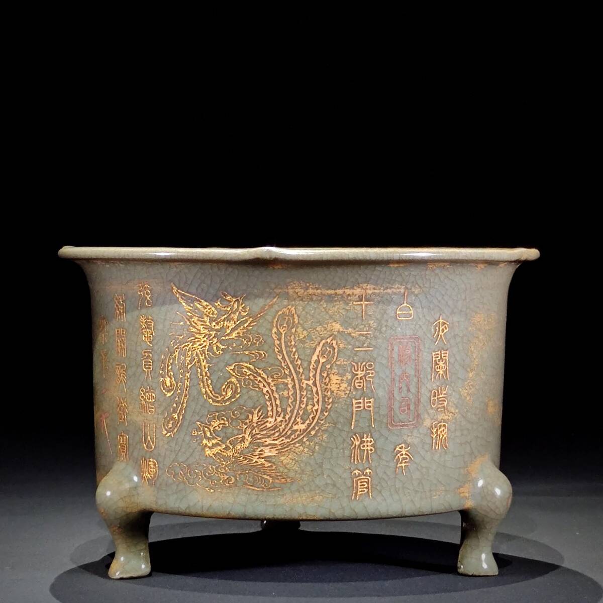 - 9_ZZ9295【惠】人間国宝 中国骨董 陶芸 磁器【汝窯刻字蒔絵御題銘文三足筆洗です】工芸品 施釉陶 青花磁 陶芸 置物 收藏品