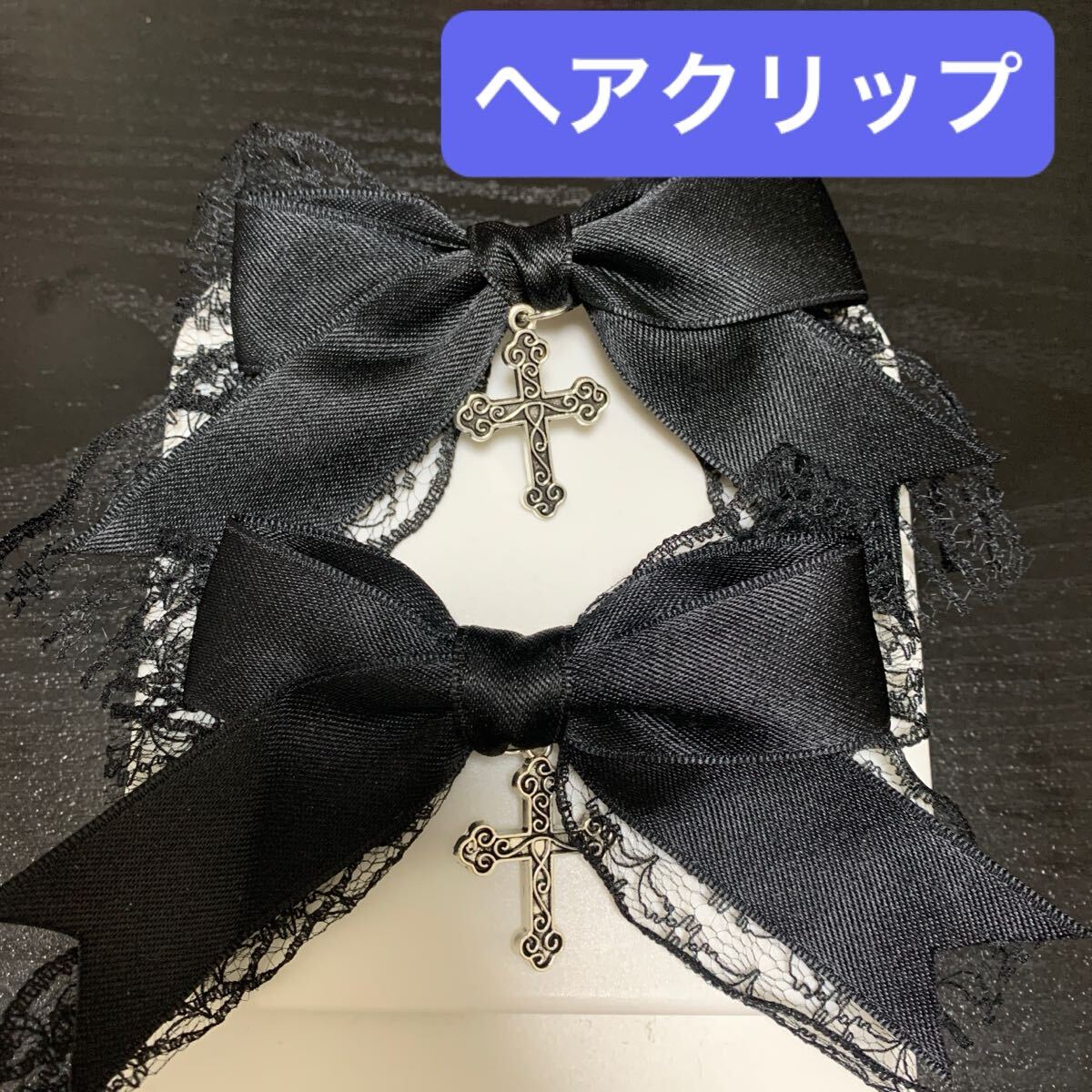 - 地雷系 ゴスロリ ブラック レース リボン 揺れる十字架 ヘアクリップ