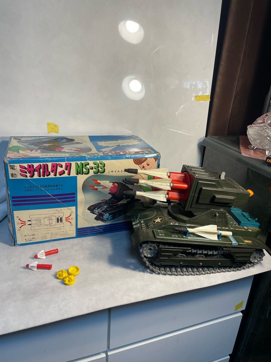 - 希少 マスダヤ 増田屋 電動ミサイルタンク MS-33 ミサイル6基付 ブリキ 箱あり 欠品破損あり 当時物 現状品 昭和レトロ