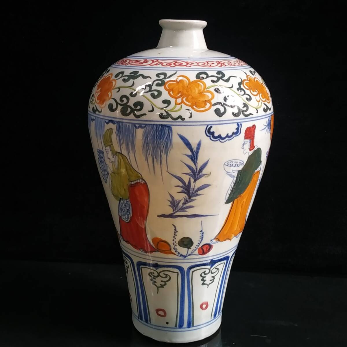 - 9KH9421 人間国宝 古磁器 白磁【元代五彩手画人物故事夜光梅瓶】 工芸品 陶芸 磁器 置物 收藏品 時代物 中国美術