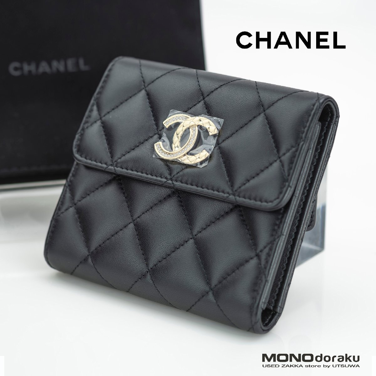 > シャネル CHANEL マトラッセ ラムスキン 三つ折り財布 ココマーク ラインストーン ブラック 美品
