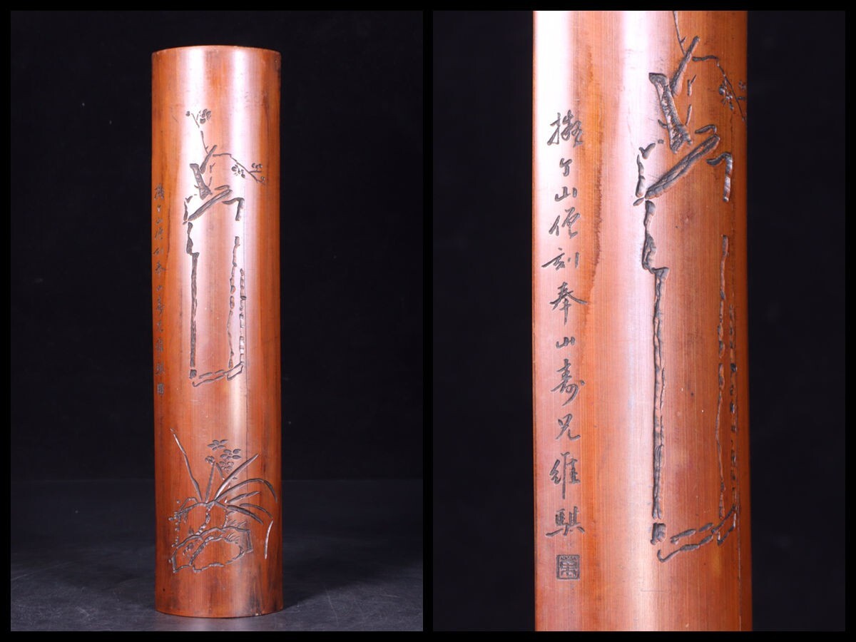 - 「清時代 老竹 彫り 刻花卉詩文 梅花紋臂擱 在銘」極細工 擺件 賞物 中国古美術 旧蔵出