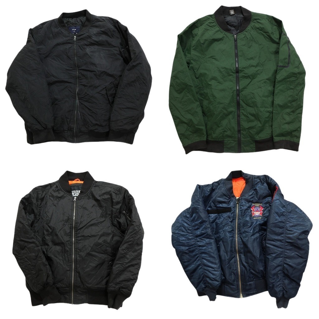 > 古着卸 まとめ売り MA-1型 ジャケット 4枚セット (メンズ XL ) 無地 袖ポケット ワッペン ブラック ネイビー 中古 古着 NC0193