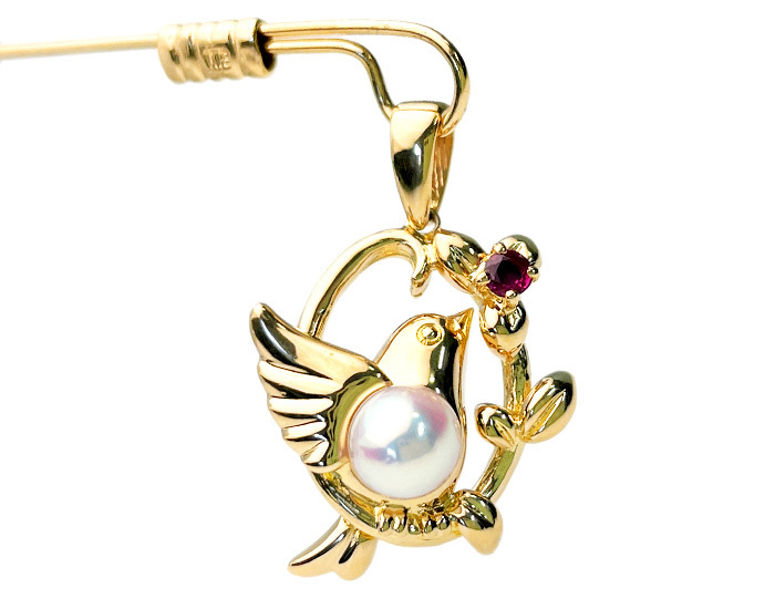> TASAKI 田崎真珠 タサキ パール ルビー ピンブローチ K18 重量5.2g アコヤパール 約5mm 小鳥 リーフ モチーフ 18金 ゴールド 新品仕上済