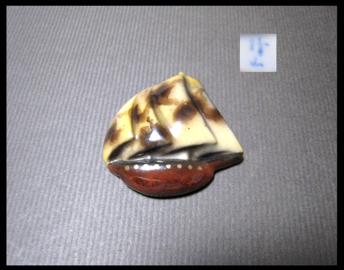 - 帆船型 陶磁器 色絵 帯留 作家物 銘有 着物 帯飾り レトロ 和装小物