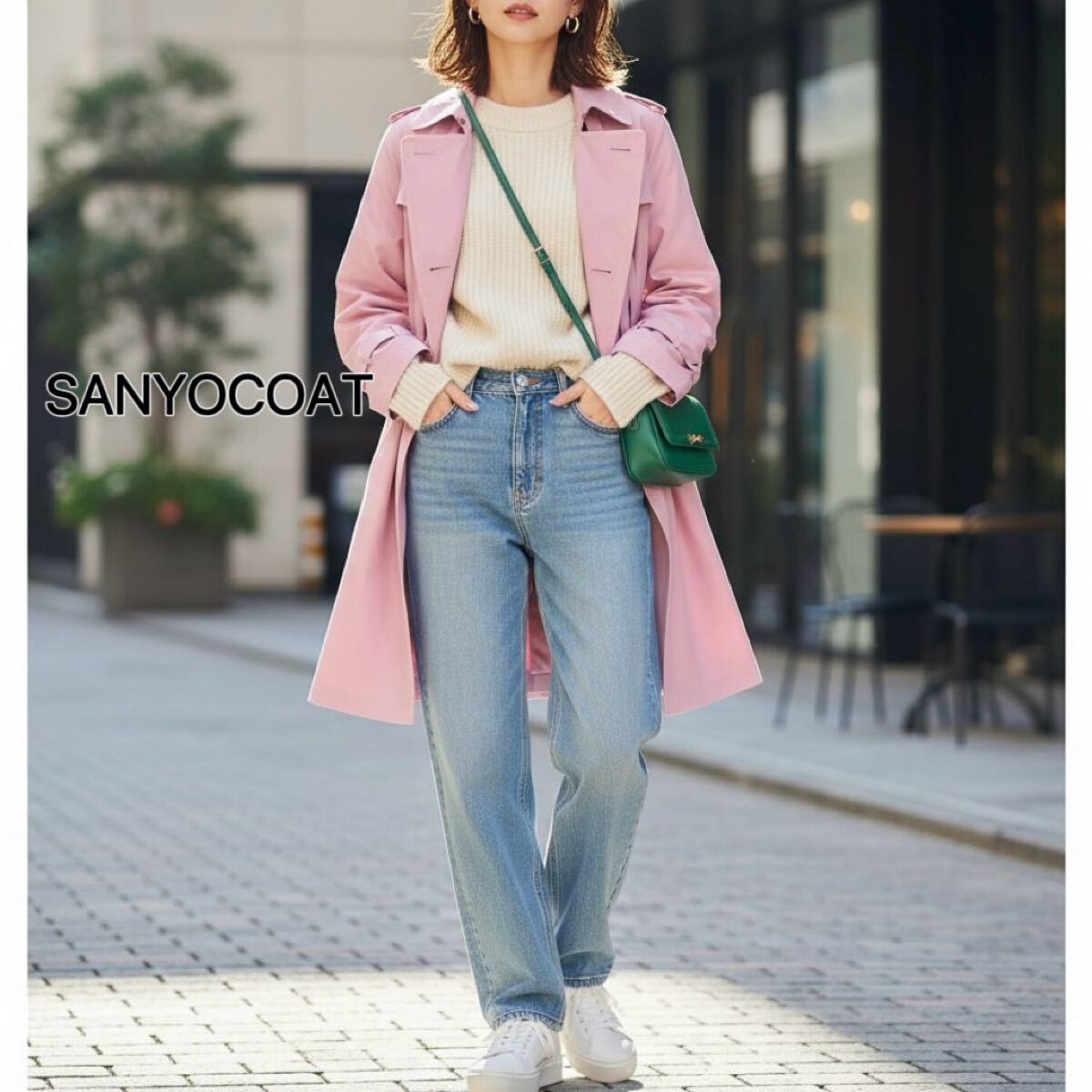 > 【美品】【現行タグ】【オーガニックコットン】SANYOCOAT サンヨーコート★ダブル トレンチコート ベルト付き ピンク系