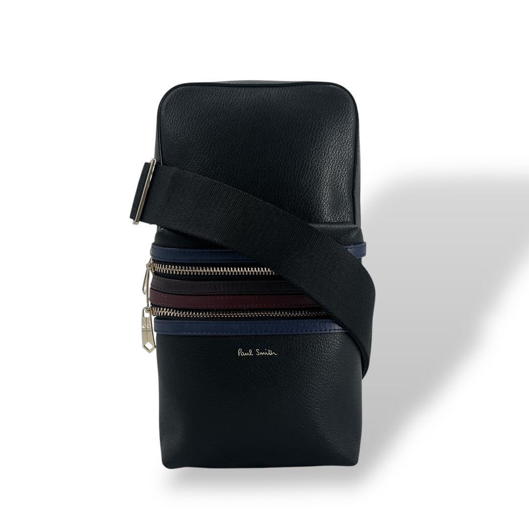 - 美品 ポールスミス Paul Smith ボディバッグ マルチストライプ シグネチャー レザー 黒 ブラック 革ロゴ ゴールド金具 ロゴ刻印