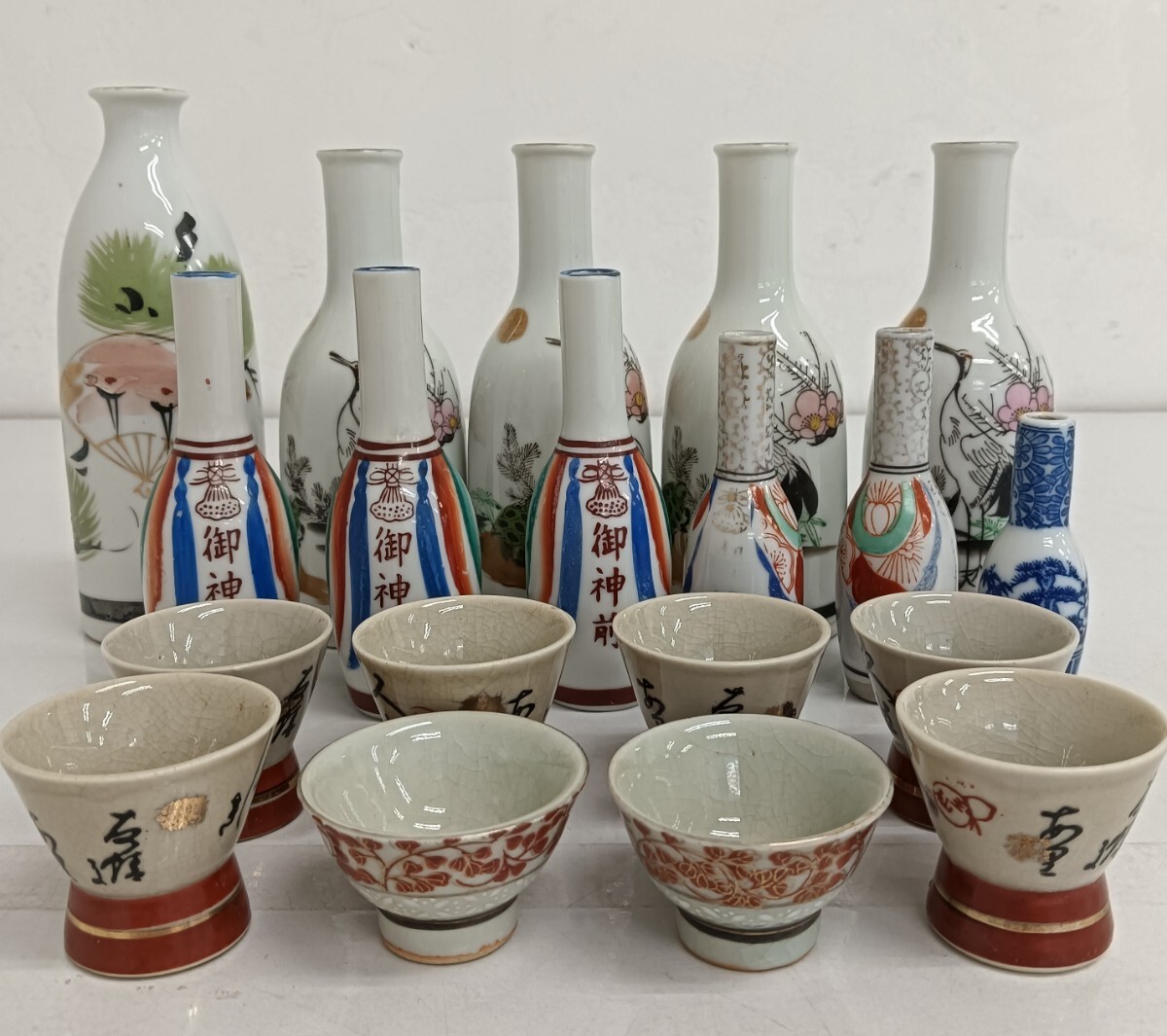 - 【25*90062】◆旧家蔵出し◆九谷焼/酒器/徳利/お猪口/盃/おまとめ◆色絵◆御神前/鶴・亀・扇文様◆陶器◆アンティーク◆骨董品