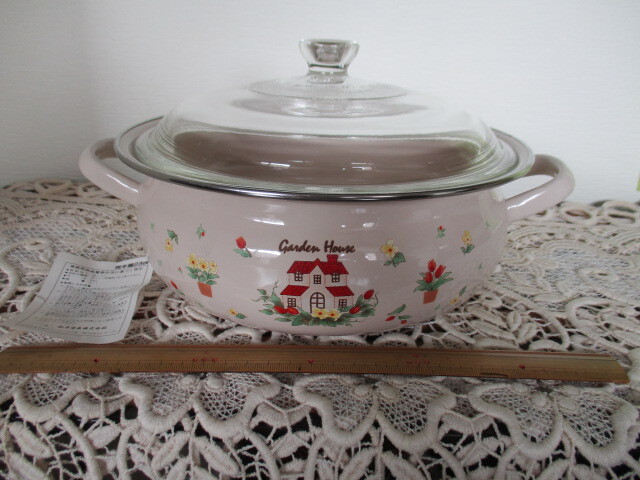 - ※ジャンク品/未使用※昭和レトロ ホーロー両手鍋23㎝・容量3.1L・底の厚さ0.6㎜(ガラス蓋付)