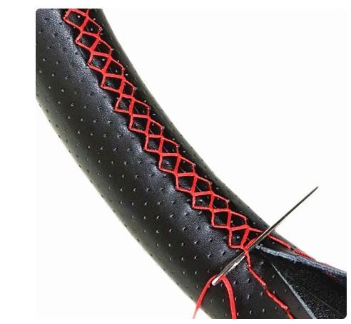 > 送料無料 未使用品 車 38cm ハンドルカバー 人工皮革 ステアリング 編み上げタイプ ブラック&レッド レッドステッチ