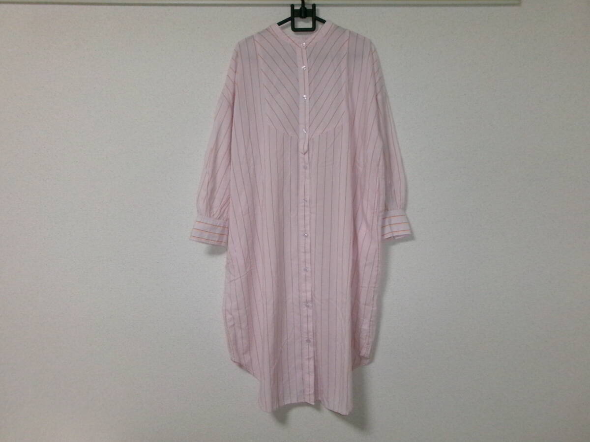 > LEPSIMレプシム☆アダストリア☆淡ピンク×オレンジ×イエローのストライプ柄☆ゆったりふんわり♪長袖シャツのワンピース☆大きめFサイズ