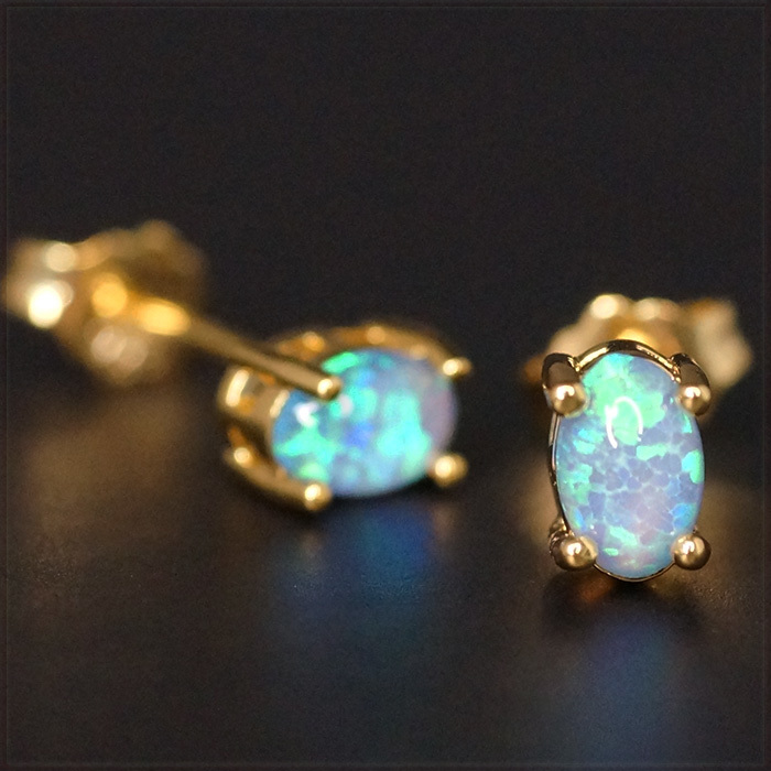 - [EARRING] 18K Gold Plated ハイクオリティ エレガント 6mm オーバル 楕円 ブルー ファイアプレシャス オパール ストーン スタッドピアス