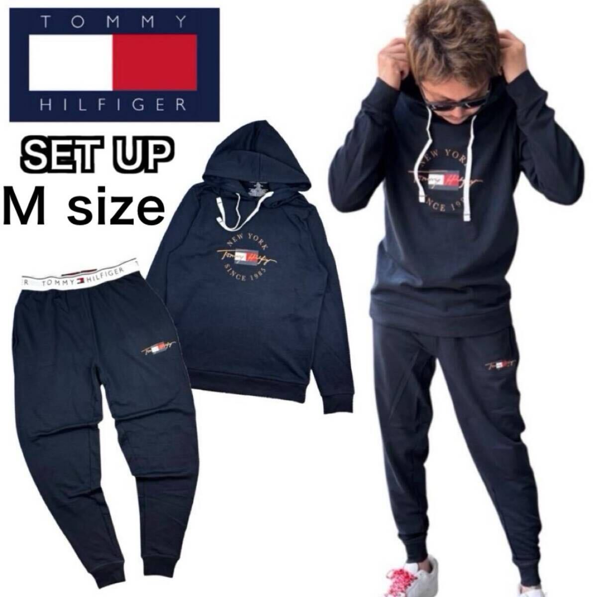 > トミーヒルフィガー セットアップ 2点セット 09T4502/4503 ネイビー Mサイズ パーカー スウェット 薄手 ジョガーパンツ ルームウェア 新品