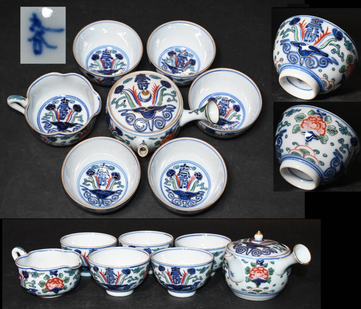 > 九谷焼 錦手 色絵金彩 花壽文 茶器 急須 煎茶碗五客 湯冷 箱無 煎茶器揃 一式 煎茶道具 寿文 茶壷 茶注 湯呑 検:中国美術 青華