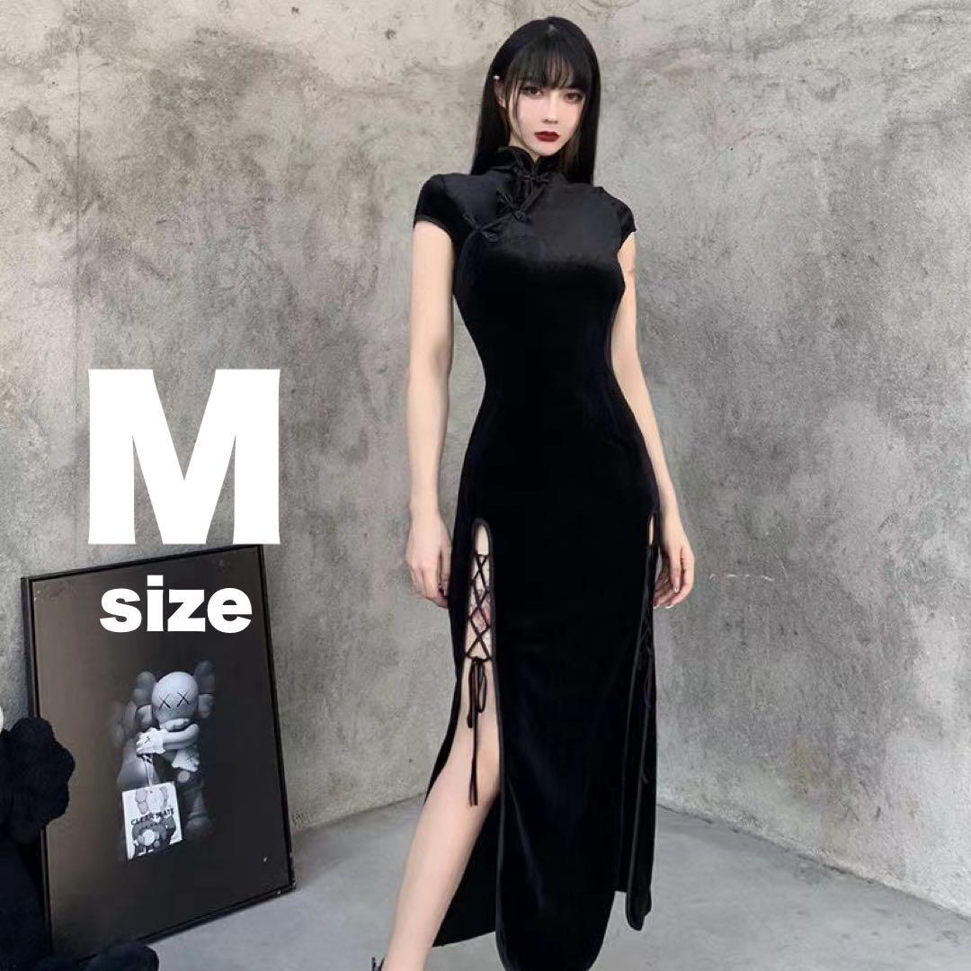 - チャイナドレス ロング 黒 M ハロウィン コスプレ 衣装 チャイナ服 仮装