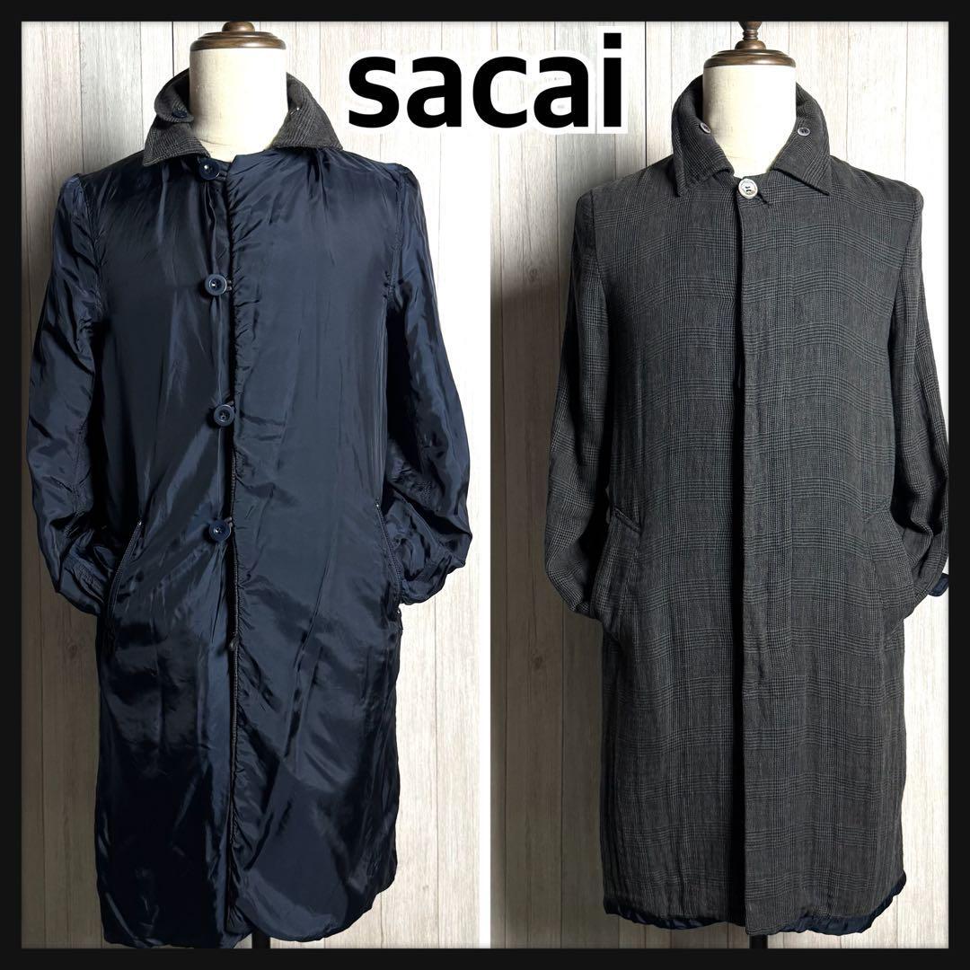 > 【希少デザイン・美品】sacai サカイ リバーシブル 光沢素材&リネン混グレンチェック ステンカラーコート ロングコート サイズ1