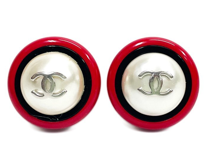 - CHANEL シャネル 96P フェイクパール イヤリング 両耳 クリップ式 ラウンド 丸形 ココマーク レッド×ブラック×シルバー ヴィンテージ
