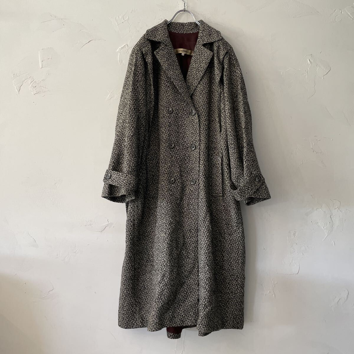 > ビンテージ フランス製 ヘリンボーン生地 ロングコート4ヴィンテージ ヨーロッパ ユーロ古着 アウター グレー ブラック ウール