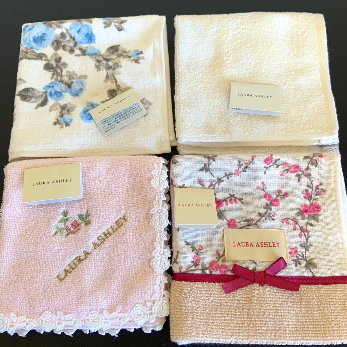 - 未使用 LAURA ASHLEY ローラアシュレイ タオルハンカチ 4枚セット 花柄 刺繍入 リボン レディース ハンカチ まとめ売り 保管品