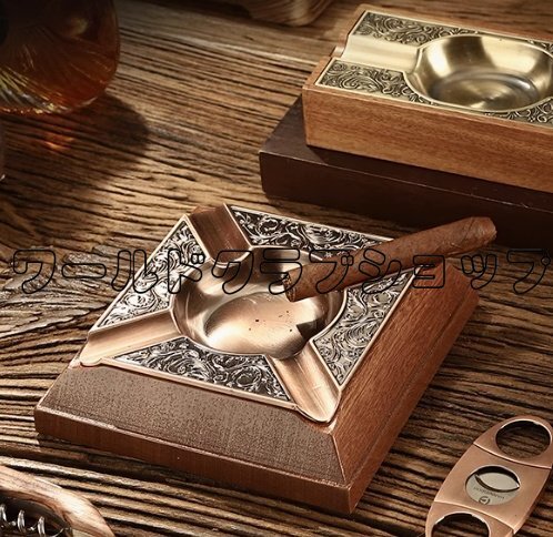 - 高級真鍮×天然木製 シガー灰皿 ワイド溝 耐衝撃 おしゃれ雪茄灰皿 家庭用・業務用対応 紫銅色