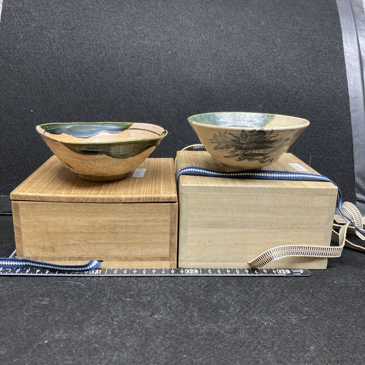 - 美濃焼き 織部抹茶碗 在銘 作者不詳 二点組 合い箱付き アンテーク