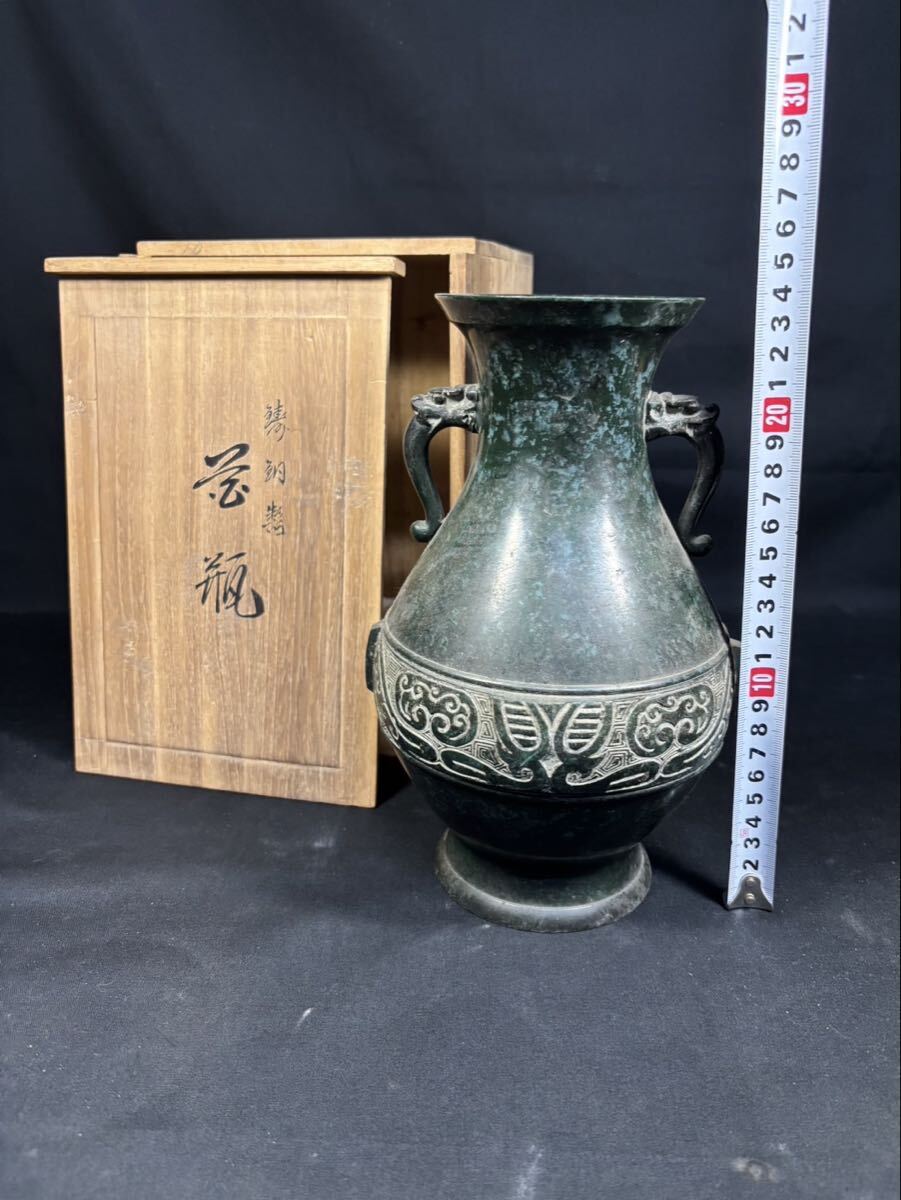 - 時代物 高岡銅器 天龍作 鋳銅 青銅 獣耳龍紋花瓶 饕餮 花瓶 花器 花入 木箱付 古物買取り 遺品整理 N31