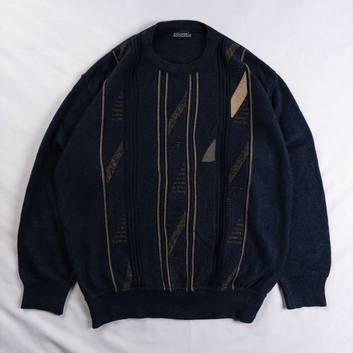 - US Vintage カナダ製 90s COOPER アクリル スエードレザーパッチ 立体 3D 幾何学模様 アート クレイジーパターン ネイビー 総柄ニット