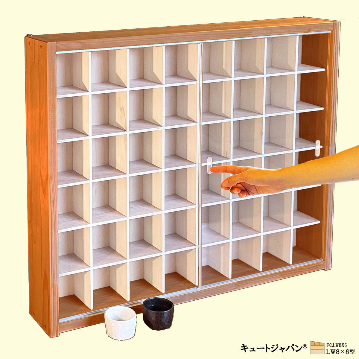 - 送料無料★お猪口 コレクション ディスプレイ 収納棚 ぐい呑み 酒器 収納ケース 48マス アクリル障子付 メープル色塗装 日本製