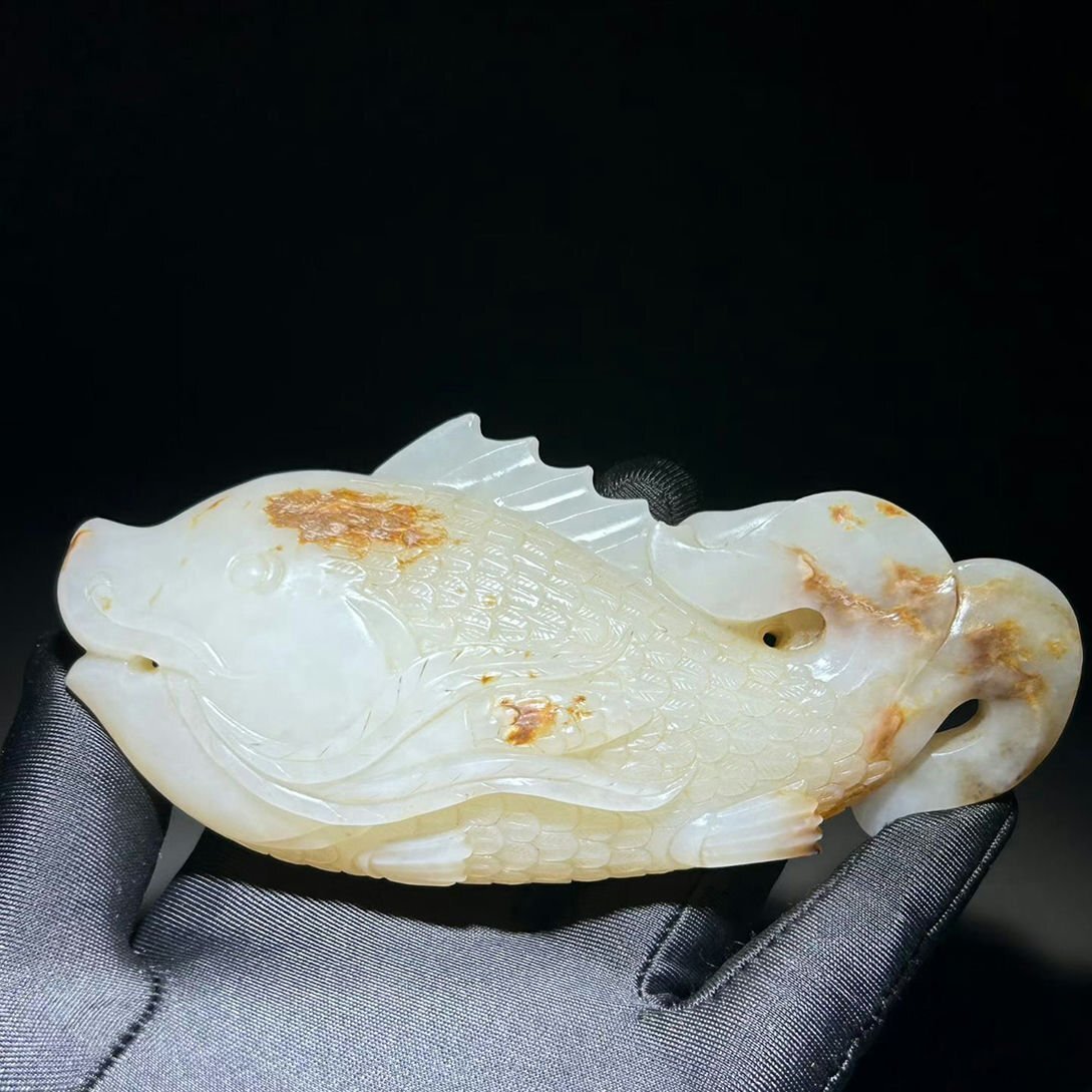 - ▼渡鶴羽▼H3164清時代 和田白玉 和田玉魚化龍置物 時代古玉細密細工★古置物★古賞物★古擺件★蒐集家放出★唐物