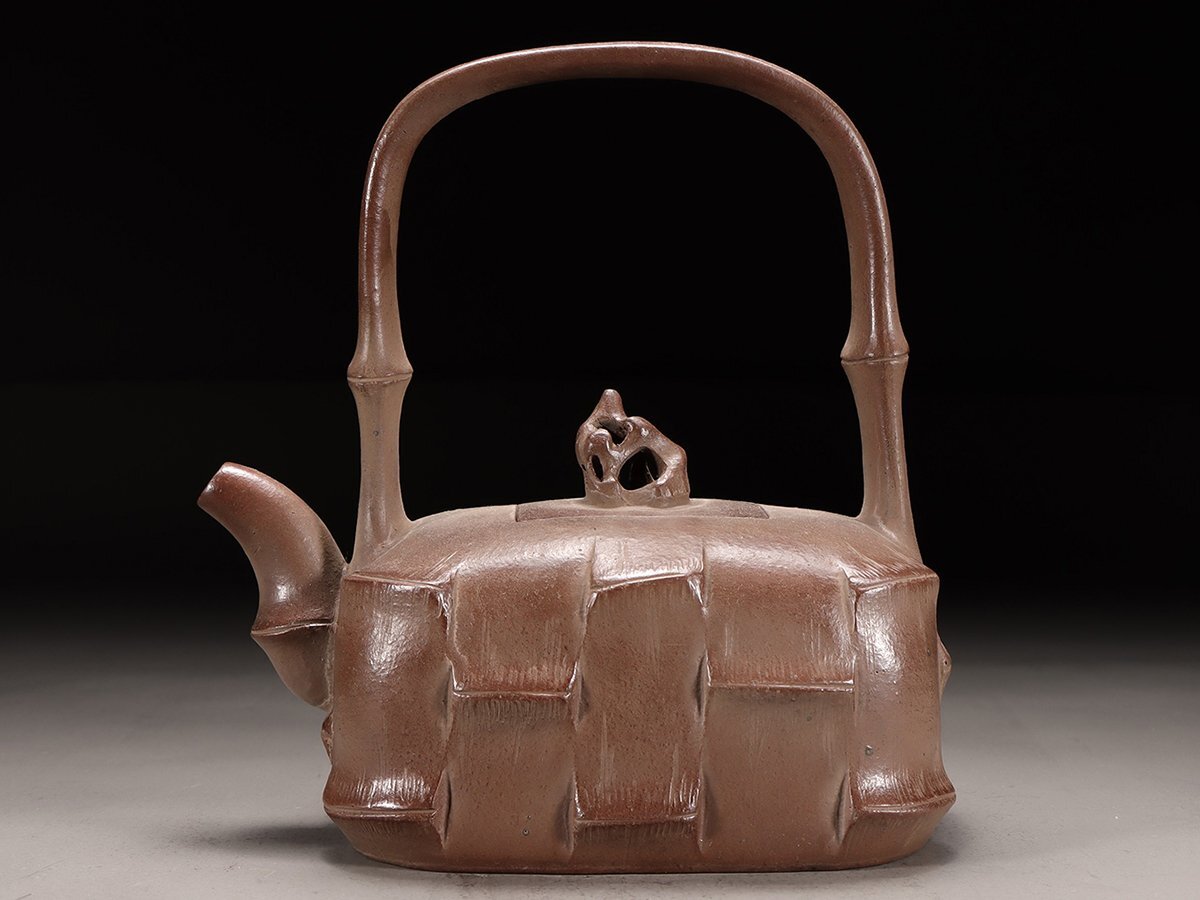 - 【安】清時代 鳴遠銘 竹編紋提梁茶壺 宜興紫砂 常滑 朱泥急須 煎茶道具 茶壷 古董品 時代物 271