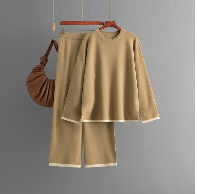 - 346 パンツスーツladiesレディース ◇ ニット素材 上質 ◇ 秋冬 上下セット 暖かい カーキ