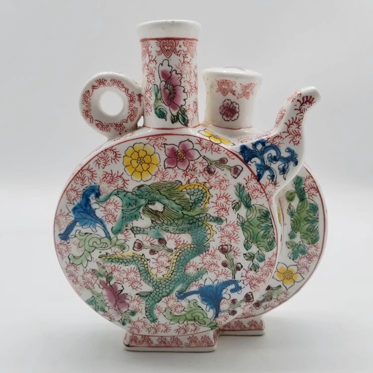- 高品質 官窯 双龍花紋 花瓶 粉彩描金 磁器 双竜 花紋 双子壺 月壺 置物 中国陶磁 鑑賞 中国美術品 装飾 収蔵 コレクションzhzx003