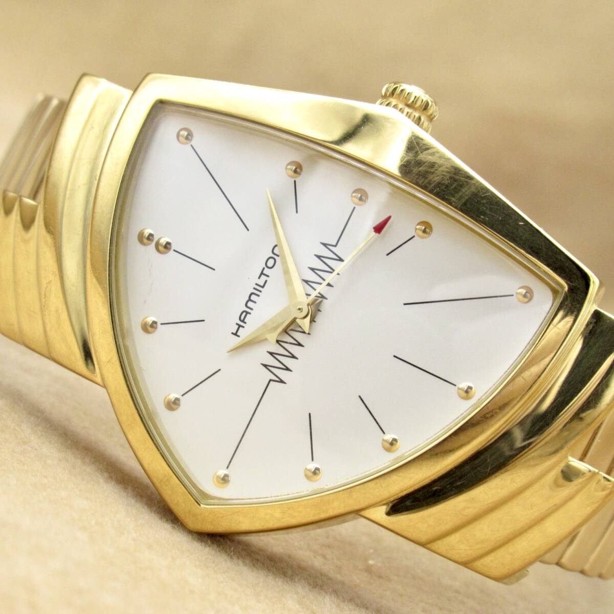 > Hamilton ハミルトン ベンチュラ H243010 ゴールド 蛇腹 レザー クォーツ QZ GP 白文字盤 稼働 VENTURA