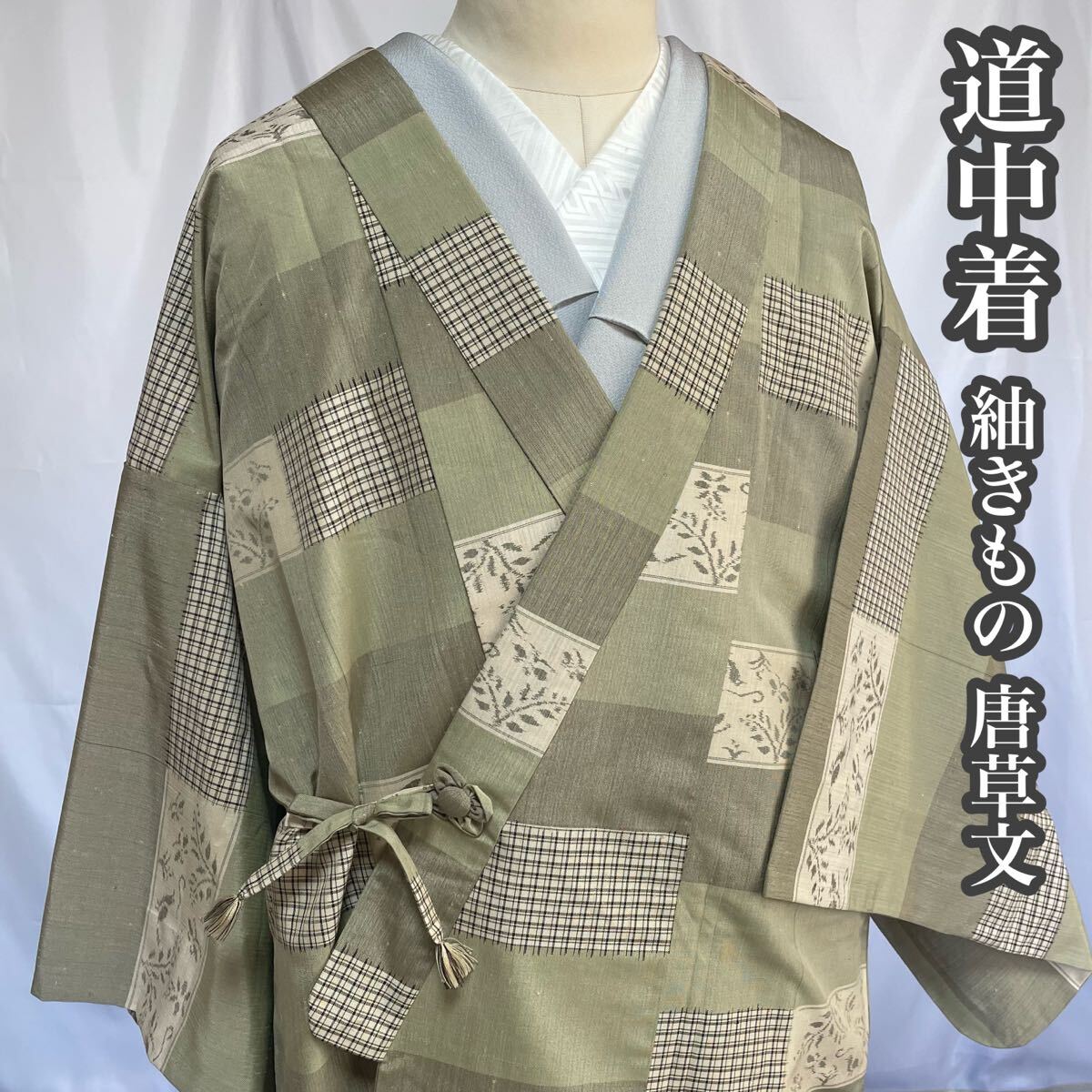 - #G055 道中着 紬きもの 唐草文 鳥 正絹 和装 和服 着物【wellriver】