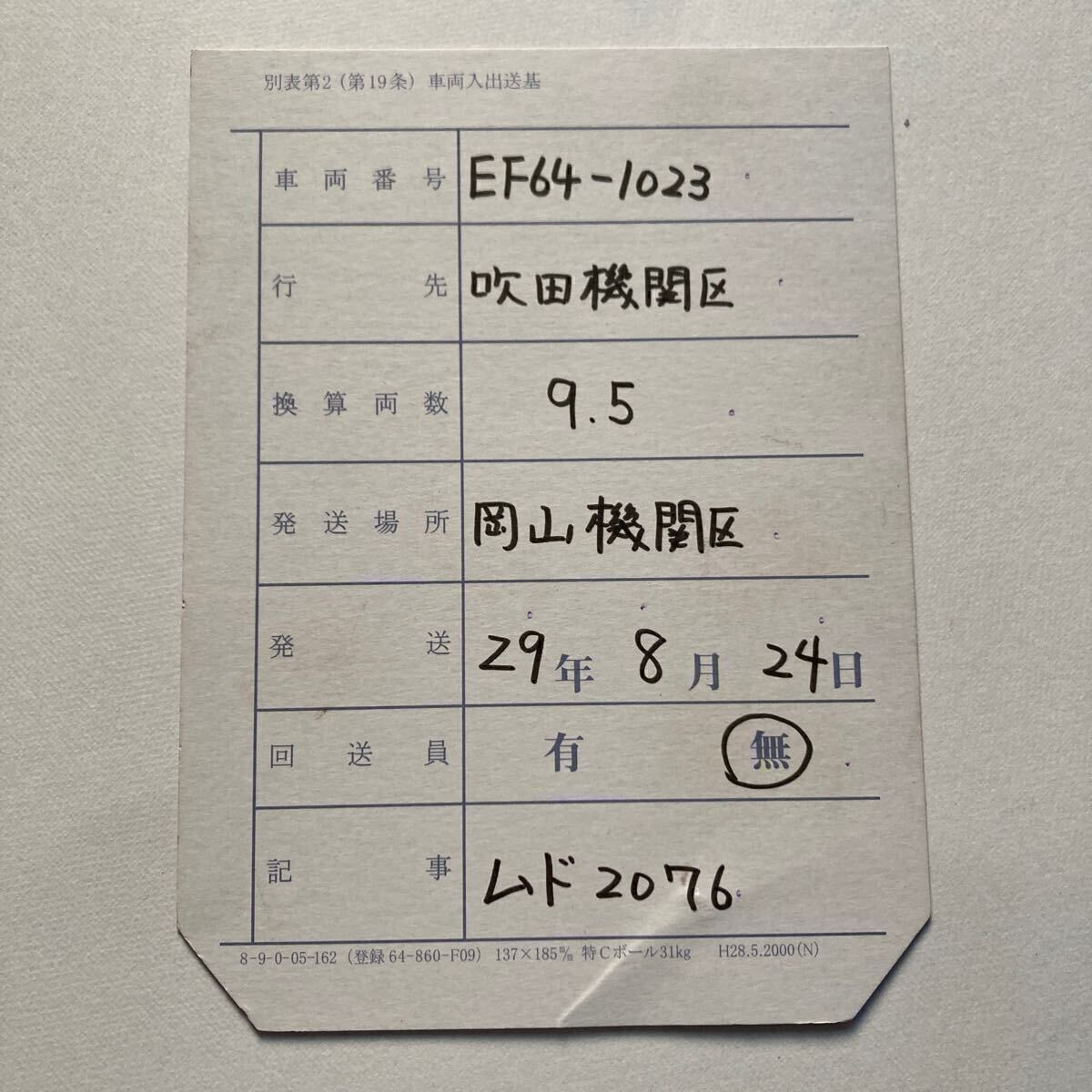 - 【回送車票】EF64ー1023/吹田機関区→岡山機関区◆平成29年8月/ムド2076