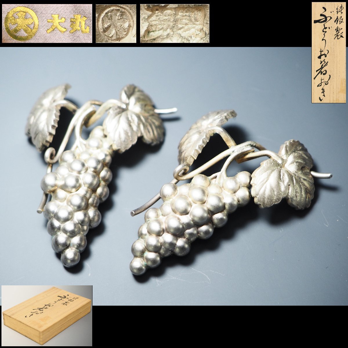 - 【治】大丸百貨店謹製 銀製 葡萄形箸置一対☆元箱付 銀重34g 小物 金工置物 オブジェ 金具 筆置 カトラリ silver 銀食器 銀器 PB451