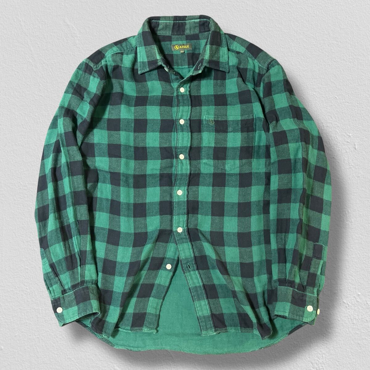 > AIGLE 長袖ネルシャツ グリーンチャック柄 L ●洗濯プレス済● エーグル 秋冬 シャツ 緑 長袖シャツ 古着/628