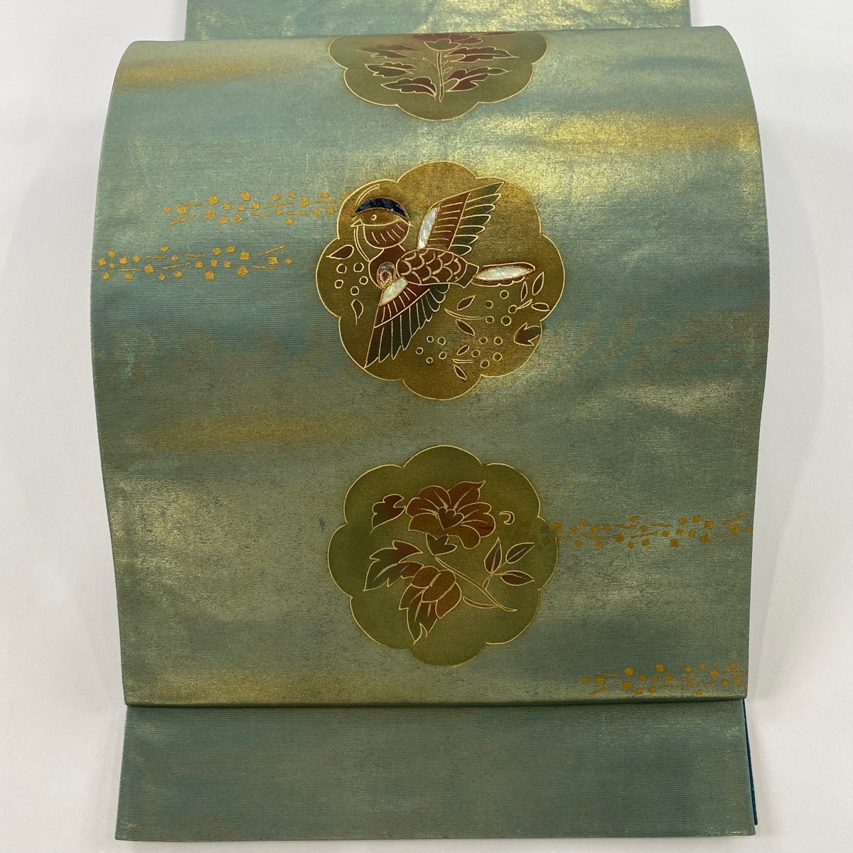 - 袋帯 秀品 花喰鳥 草花 螺鈿 金彩 緑 お太鼓柄 正絹 【中古】
