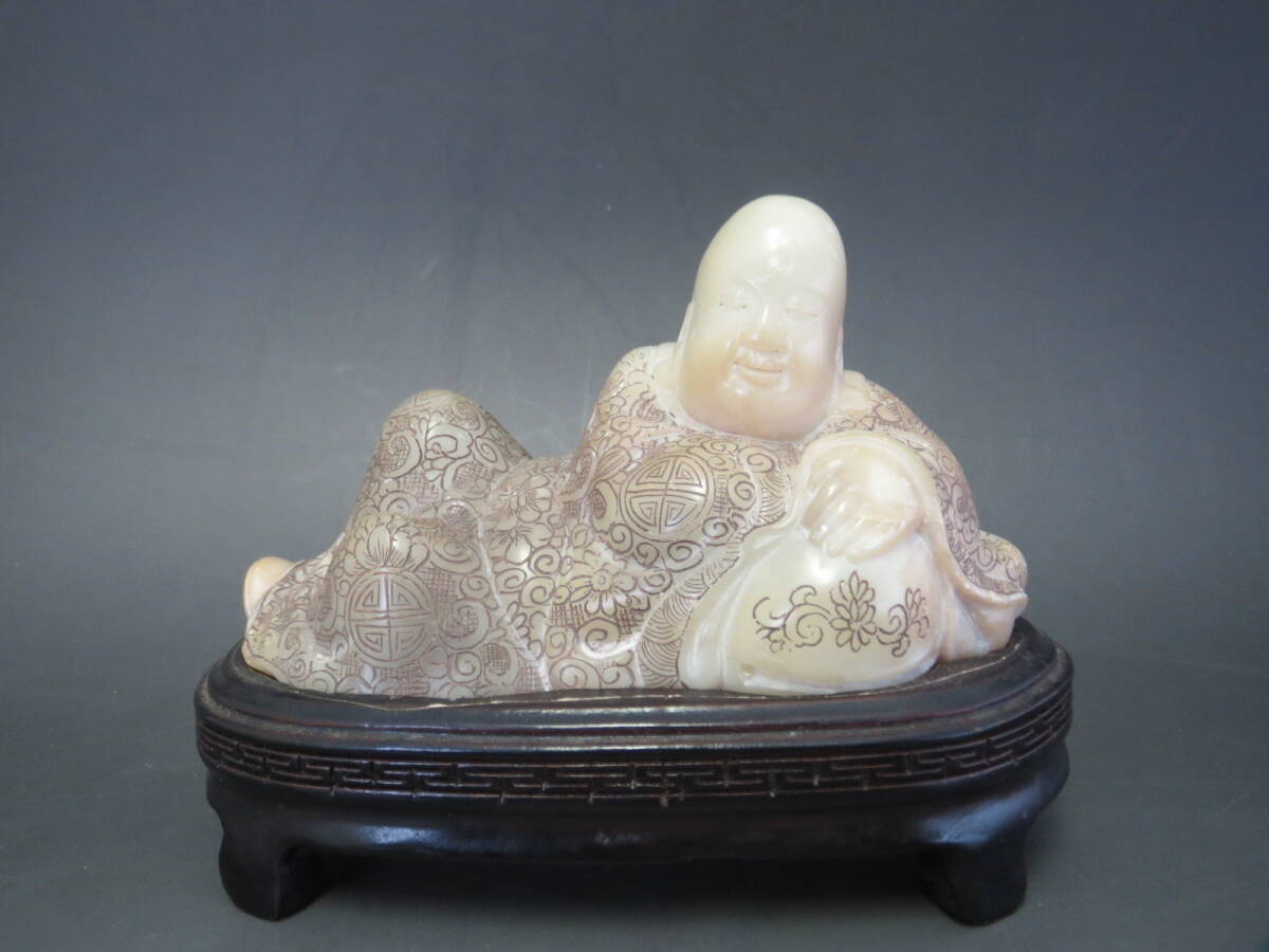- 初だし★中国美術 玉彫精密細工 布袋 置物★検)仏教美術・ 古玉・ 白玉・和田玉・寿山石・唐物