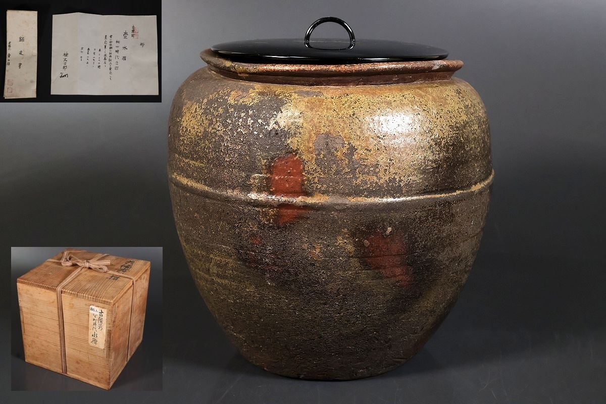 > 【小】5319 桃山時代 古備前窯変壺 牡丹餅景色 古備前水指 桂又三郎書付有 保管箱有 茶道具