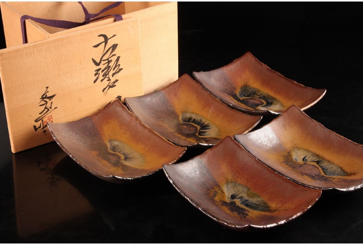 - [URA]森脇文直 作/古瀬戸皿5客/共箱/4-9-177 (検索)骨董/瀬戸焼/美濃焼/小皿/角皿/刺身皿/刺身鉢/小鉢/向付/茶碗/懐石道具/懐石料理