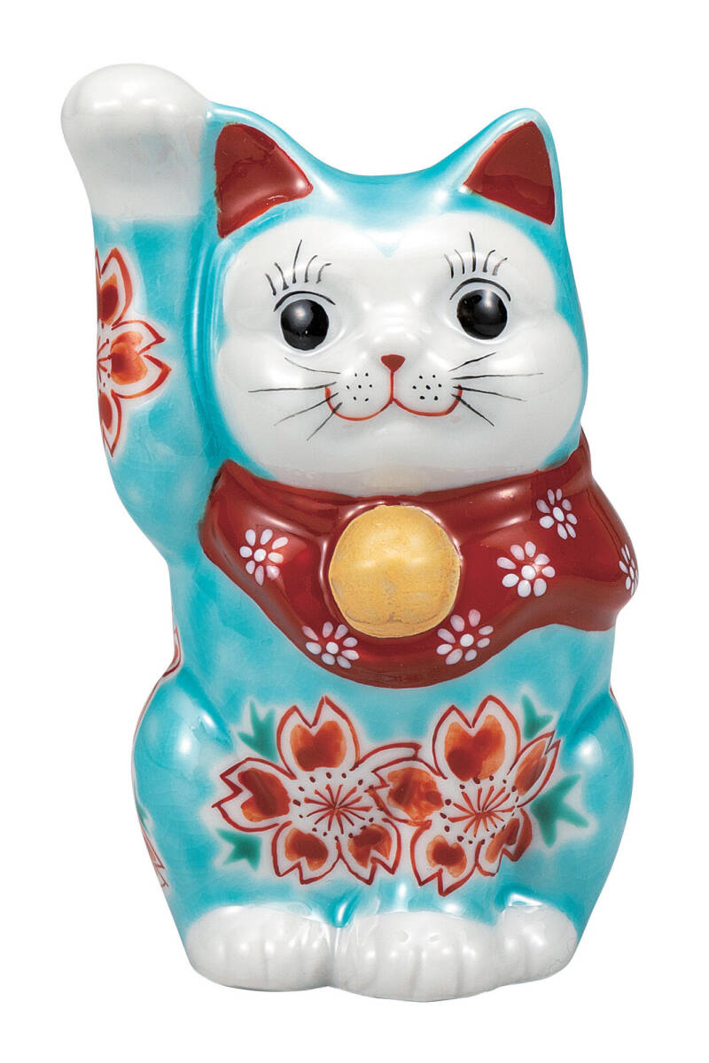 - 九谷焼! ☆トルコブルー釉桜・招き猫4号☆ K9-1581 新品 商売繁盛 縁起物 千客万来 開運 置物 招き猫 ギフト