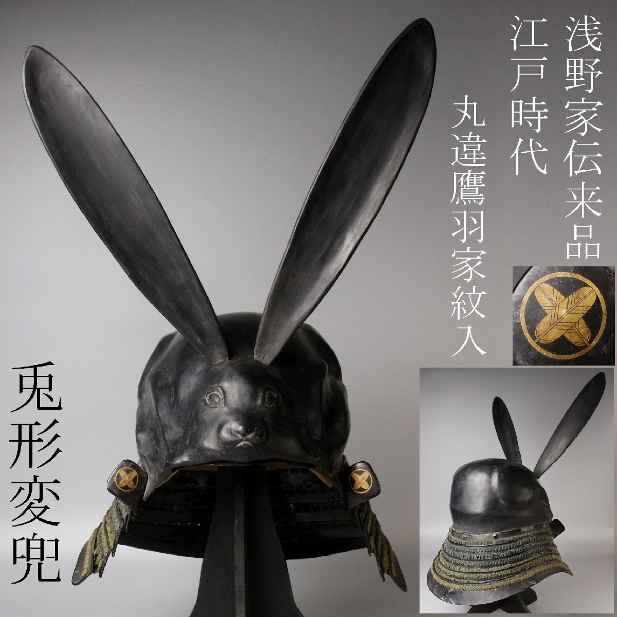 > 【LIG】浅野家伝来品 江戸時代 丸違鷹羽家紋入 兎形兜 変わり兜 鎧兜 時代武具 珍品 [.WIY]25.9