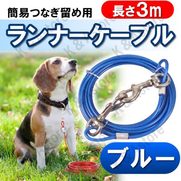 > 犬 係留リード ランナーケーブル 庭 ロングリード ワイヤーリード 外飼い しつけ用 鎖 くさり ロープ 小型犬 中型犬 大型犬 ブルー 青 3M