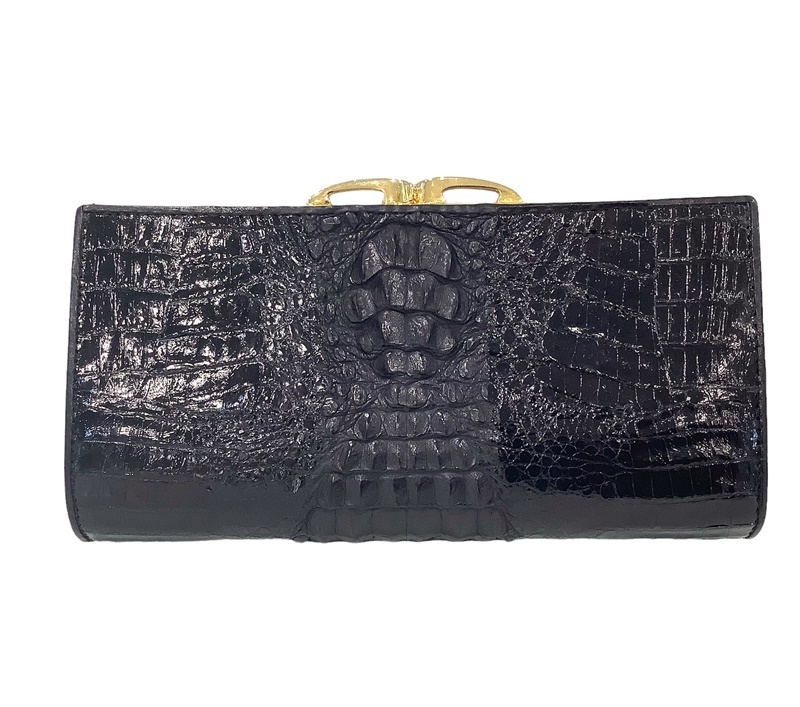 - ジェニュインレザー ELSUS GENUINE LEATHER クラッチバッグ クロコ ブラック がま口 レザー BAG【中古】KB-8090