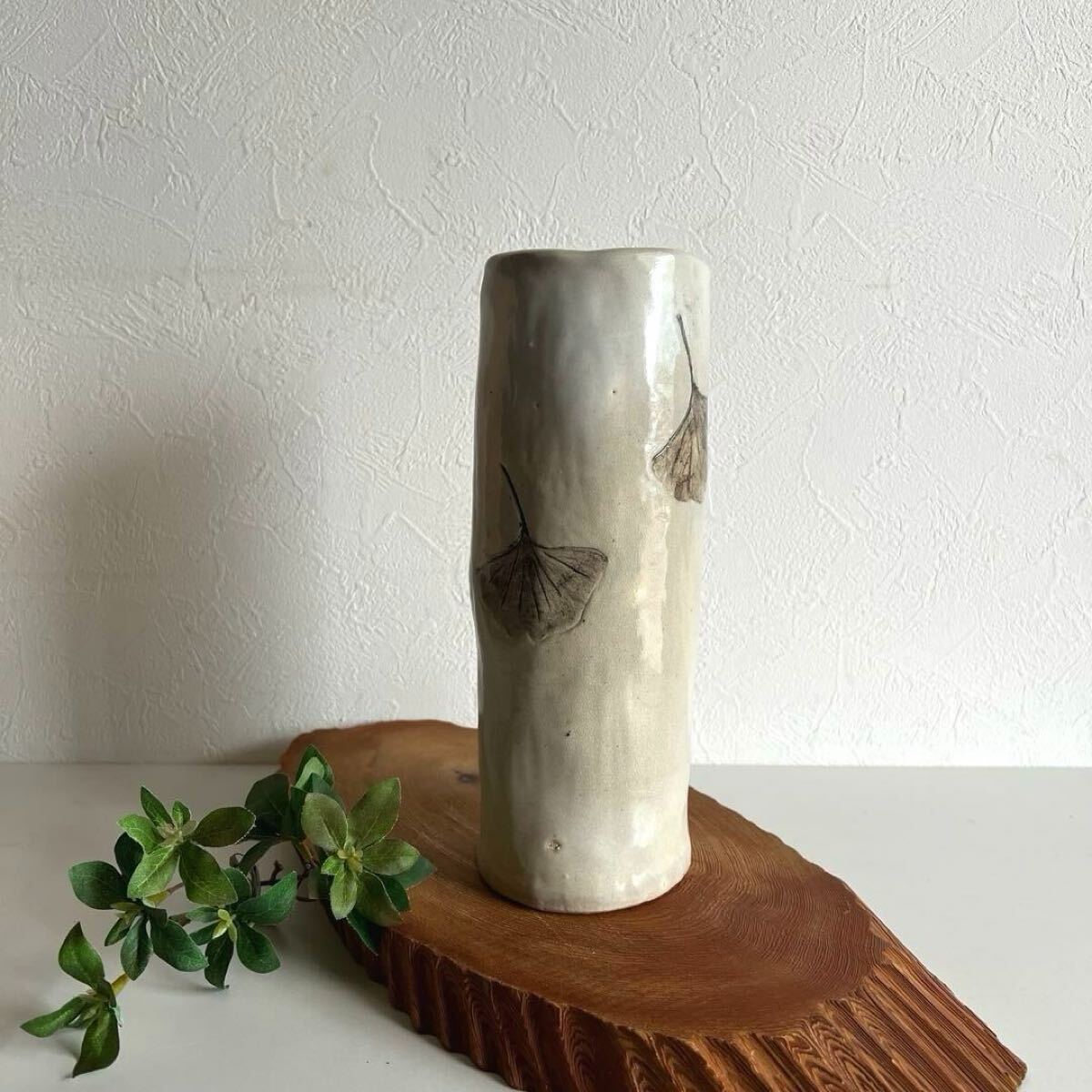 > wasabi k910 和陶器 銀杏葉花瓶 イチョウの葉デザインの素敵な花器・フラワーベース 繊細な葉脈を見事に再現したような貫入釉 モノトーン調