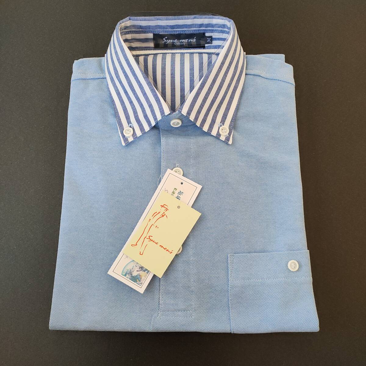 > 新品タグ付き 日本製 半袖 シャツ ワイシャツ ブルー ストライプ襟 メンス ビジネス Mサイズ syue mens